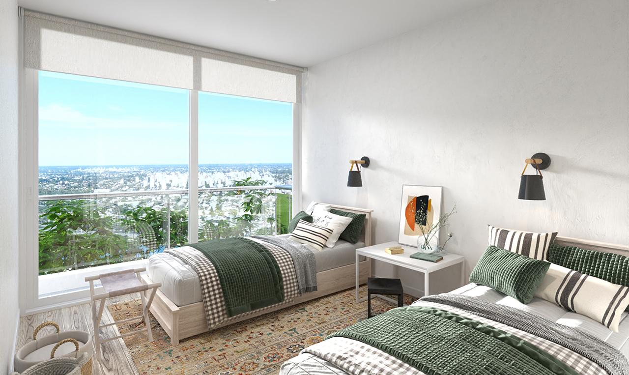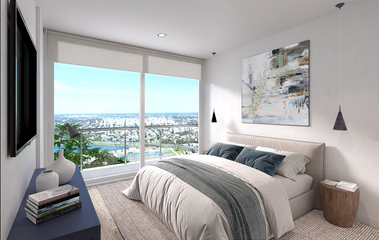 Todas las ventanas de las unidades de vivienda tendrán un sistema de cortinas Roller doble Blackout con un sistema de domótica que permitirán ser reguladas mediante el celular.